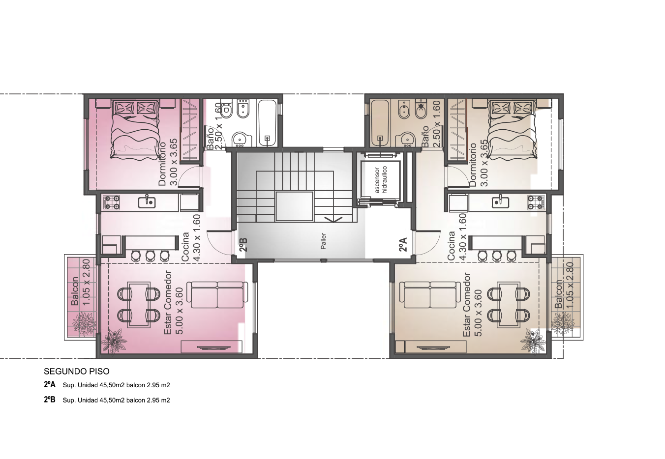 Departamento de 2 ambientes unidad 2ºA Superficie cubierta de 45,5 m2 compuesta por estar comedor, cocina, baño y dormitorio con Balcón al frente